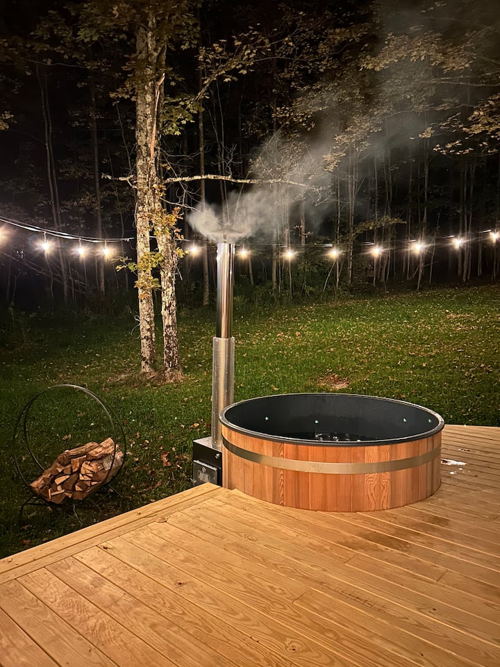 สวนหลังบ้านมีดาดฟ้าขนาดใหญ่ที่สวยงามพร้อมอ่างน้ำร้อนไม้ซีดาร์ในตัวและห้องซาวน่าแบบบาร์เรล ที่พักมีชุดรับประทานอาหาร 12 ที่นั่งและพื้นที่นั่งเล่นที่อบอุ่นและมีหลังคาคลุมเหมาะสำหรับการผ่อนคลายขณะทำอาหารบนเตาย่างบาร์บีคิวล้อมรอบด้วยต้นไม้และเสียงของธรรมชาติ