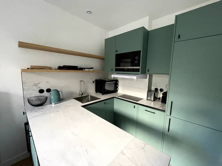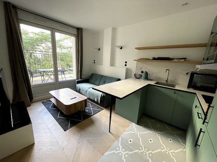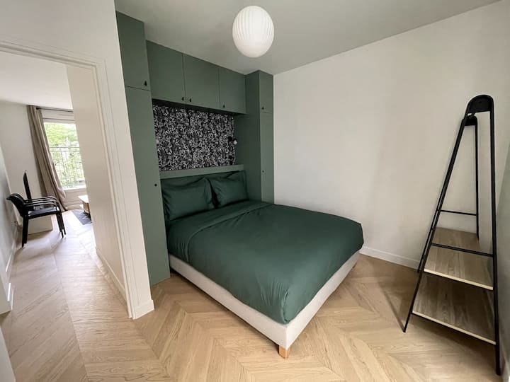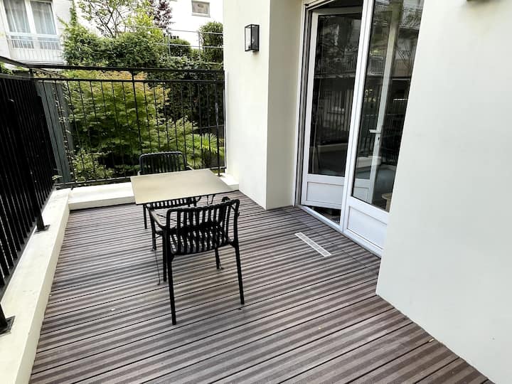 อพาร์ทเมนท์ชั้นล่างนี้ได้รับการปรับปรุงใหม่ทั้งหมดโดยสถาปนิกให้สภาพแวดล้อมการอยู่อาศัยที่สง่างามและประณีต ตกแต่งและติดตั้งวัสดุและเฟอร์นิเจอร์ระดับไฮเอนด์ประกอบด้วยห้องที่สดใสสองห้อง ห้องนั่งเล่นมีทีวีและโซฟาเบดเปิดออกสู่ห้องครัวที่ทันสมัยและมีอุปกรณ์ครบครัน ห้องนอนมีที่เก็บของกว้างขวางมีฟูกนอนระดับพรีเมียมและผ้าปูที่นอนสุดหรูจาก Compagnie des Vosges พื้นที่ซักรีดห้องสุขาแยกต่างหากและห้องน้ำที่มีฝักบัวอาบน้ำแบบวอล์คอินทำให้ที่พักสมบูรณ์ ระเบียงขนาด 15 ตารางเมตรมองเห็นสวนด้านในของอาคารนำความสะดวกสบายแสงธรรมชาติและความเงียบสงบมาสู่อพาร์ทเมนท์ที่ยอดเยี่ยมแห่งนี้ตั้งอยู่ใจกลางปารีส