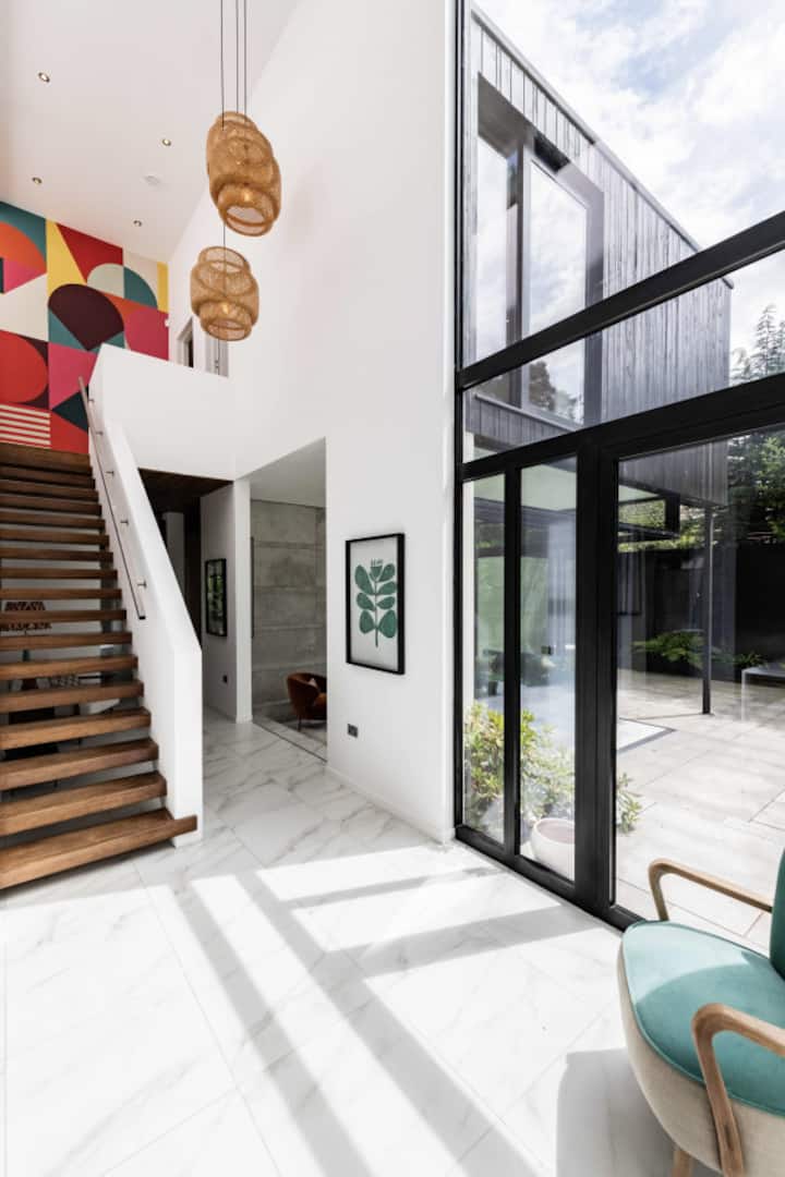 ด้านหลังชั้นล่างยังมีห้องนอนขนาดคิงไซส์ห้องสาธารณูปโภคที่มีประโยชน์และห้องสุขาที่ตกแต่งอย่างน่าอัศจรรย์บันไดหลักตั้งอยู่ใจกลางบ้านหลังนี้และสร้างการเล่นเงาที่ยอดเยี่ยมในบริเวณนั้นของบ้านเมื่อแสงแดดอยู่ในตำแหน่งที่เหมาะสมบนท้องฟ้า