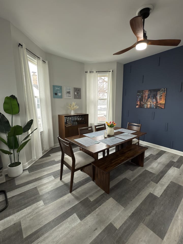 อพาร์ทเมนท์ชั้นสองที่กว้างขวางแห่งนี้ในอาคารหลายครอบครัวที่ได้รับการดูแลอย่างดีรองรับผู้เข้าพักได้ 6 คนอย่างสะดวกสบาย เพลิดเพลินกับความเป็นส่วนตัวและสิ่งอำนวยความสะดวกที่ทันสมัยในที่พักของคุณเองในขณะที่แชร์อาคารกับผู้เข้าพักรายอื่น ตั้งอยู่ใกล้กับร้านค้าท้องถิ่นร้านขายของชำและร้านอาหาร เป็นสถานที่ที่สมบูรณ์แบบสำหรับการเข้าพักที่สะดวกสบาย อพาร์ทเมนท์แห่งนี้เข้าถึงใจกลางเมืองชิคาโกได้อย่างรวดเร็วจึงเป็นสถานที่พักผ่อนที่เงียบสงบสำหรับครอบครัวและนักเดินทาง
