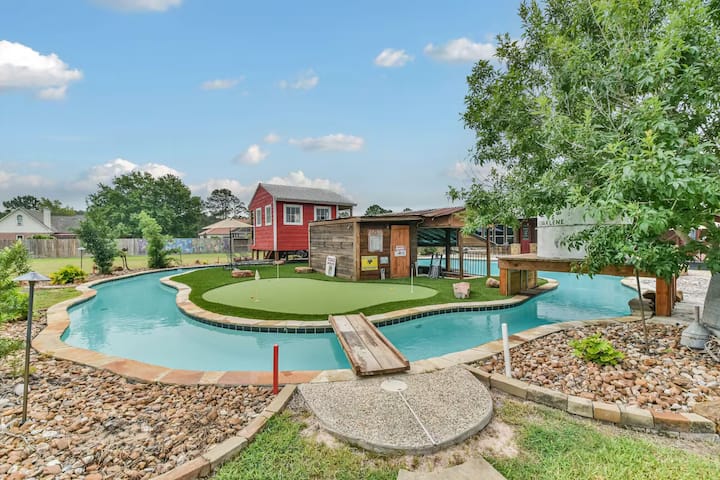 พื้นที่กว่า 2 เอเคอร์พร้อมสระว่ายน้ำ 70,000 แกลลอนพร้อมแม่น้ำขี้เกียจและบาร์ว่ายน้ำวางสีเขียวบ่อตกปลาที่มีสต็อกหลุมไฟ 2 หลุมระเบียงที่มีหลังคาที่จอดรถลานบ้านที่มีหลังคาและอื่นๆอีกมากมาย! นอนได้สบายๆ 10 คน