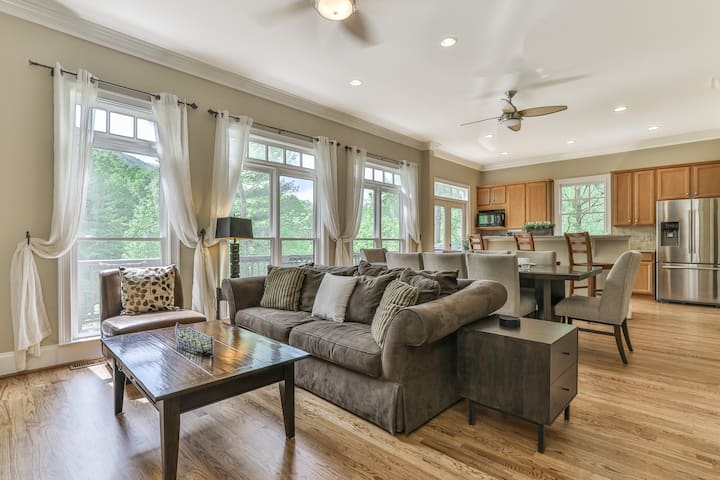 พื้นที่นั่งเล่นเป็นแบบเปิดโล่งพร้อมพื้นที่นั่งเล่นห้องรับประทานอาหารและห้องครัวที่เปิดออกสู่ผนังหน้าต่างเพลิดเพลินไปกับลำห้วยทะเลสาบและวิวป่า พื้นที่นั่งเล่นเหมาะสำหรับให้ความบันเทิงแก่เพื่อนและครอบครัวพร้อมที่นั่งสบายๆสำหรับทีวีจอแบนขนาดใหญ่ของกลุ่ม - เหมาะสำหรับการเล่นเกมหรือการสังสรรค์ ดาดฟ้ากลางแจ้งมีวิวภูเขาที่สวยงามเก้าอี้พักผ่อนโต๊ะรับประทานอาหารและเตาย่างแก๊สขนาดใหญ่ - เจ้าของเตาย่างจะจดจำวิวตลอดทั้งปี :) ระเบียงที่ได้รับการคัดกรองอย่างกว้างขวางมีที่นั่งที่หรูหราและสะดวกสบายซึ่งสร้างพื้นที่ที่สนุกสนานและน่าอยู่เพื่อรวมตัวกันและสร้างความทรงจำ