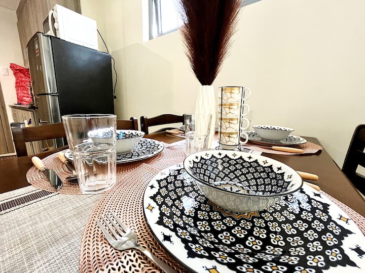 ห้องครัวและห้องรับประทานอาหาร: เครื่องกรองน้ำโต๊ะและเก้าอี้รับประทานอาหารตู้เย็นไมโครเวฟกาต้มน้ำไฟฟ้าหม้อหุงข้าวและอุปกรณ์รับประทานอาหารพื้นฐานสบู่ล้างมือ + น้ำยาล้างจาน