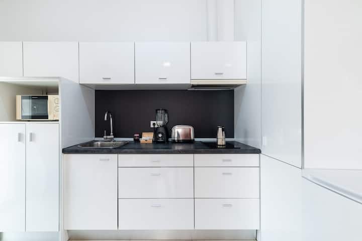 - ห้องครัวมีเตาแม่เหล็กไฟฟ้าอุปกรณ์ทำอาหารที่จำเป็นเช่นชุดมีดช้อนส้อมและพลั่วไม้ที่เปิดจุกก๊อกกาต้มน้ำเครื่องปิ้งขนมปังเครื่องชงกาแฟไมโครเวฟตู้เย็นตู้แช่แข็ง