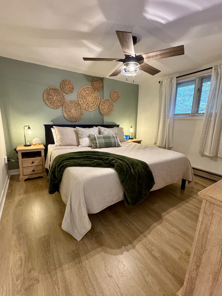 ห้องนอนของเรามีเตียงขนาดคิงไซส์พร้อมผ้าปูที่นอนผ้าฝ้าย 100% ผ้าฝ้ายขัดเงาที่อบอุ่นและผ้าห่มเสริมสำหรับคืนฤดูหนาวที่อากาศหนาวเย็น ความร้อนจากบัวเชิงผนังและพัดลมเพดานช่วยให้มั่นใจได้ว่าคุณจะได้รับความสะดวกสบายไม่ว่าคุณจะไปเยี่ยมชมในช่วงเวลาใดของปี!