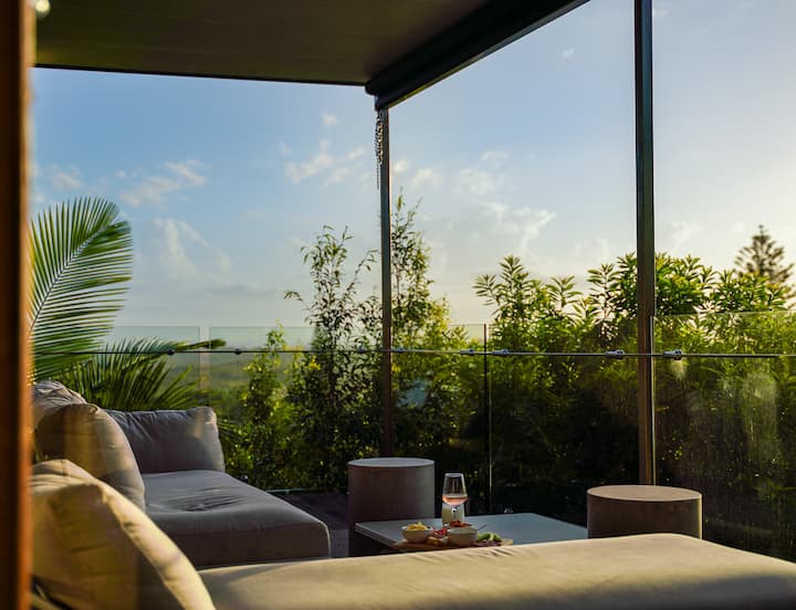 ชั้นบนสุดห้องซาวน่าอินฟราเรด 4 คนพร้อมเตียงนอนเล่นในตัว 2 เตียงพร้อมวิวด้านหลังที่น่าทึ่ง