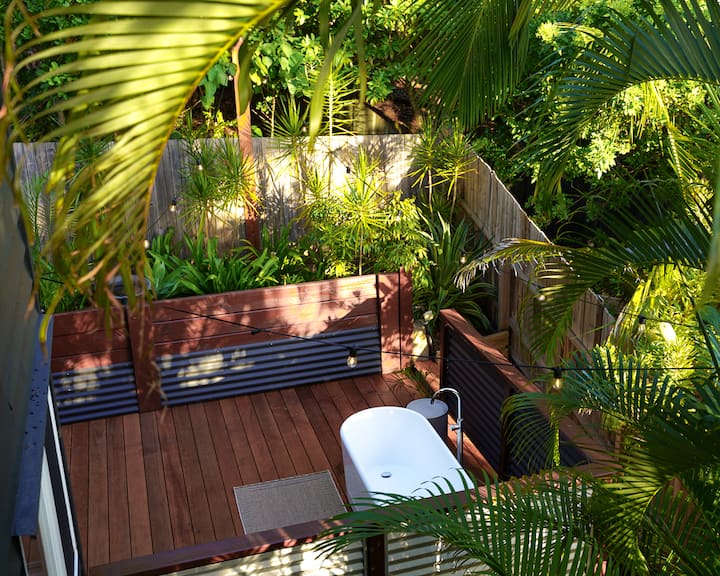 ดาดฟ้าร่มรื่นด้านหลังขนาดใหญ่บนชั้นสองสำหรับเล่นโยคะอ่านหนังสือหรืออาบน้ำ เลานจ์วันไม้ที่สร้างขึ้นพร้อมเบาะรองนั่งที่เก็บไว้ภายในในช่วงฝนตก