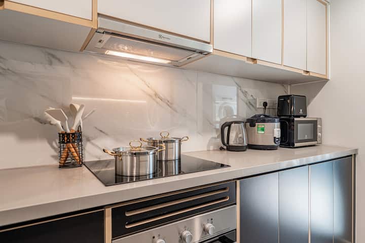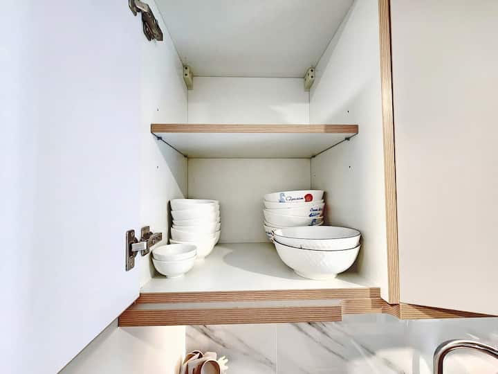 - อุปกรณ์ทำอาหารและรับประทานอาหารสำหรับ 8 คน (หม้อหุงต้มแบบเหนี่ยวนำคู่เครื่องปิ้งขนมปังหม้อหุงข้าวไฟฟ้าเตาอบหม้อต้มน้ำไมโครเวฟจานชามเครื่องทำความสะอาดเครื่องกรองกาแฟ …)