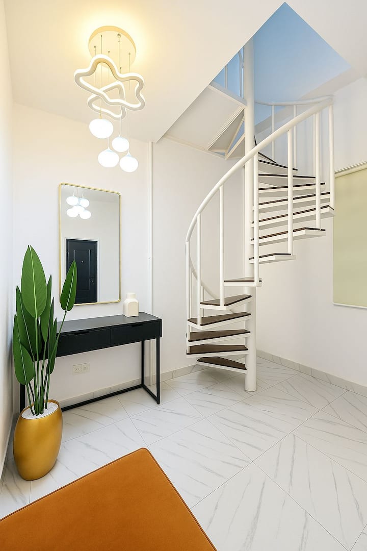 อพาร์ทเมนท์ต้อนรับคุณด้วยชั้นล่างที่นำไปสู่บันไดของพื้นที่นั่งเล่นส่วนตัวของคุณที่ชั้นบน