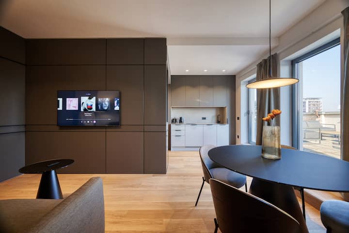 เพนท์เฮาส์สีดำพร้อมด้วยระเบียงที่สวยงามใจกลางเมือง