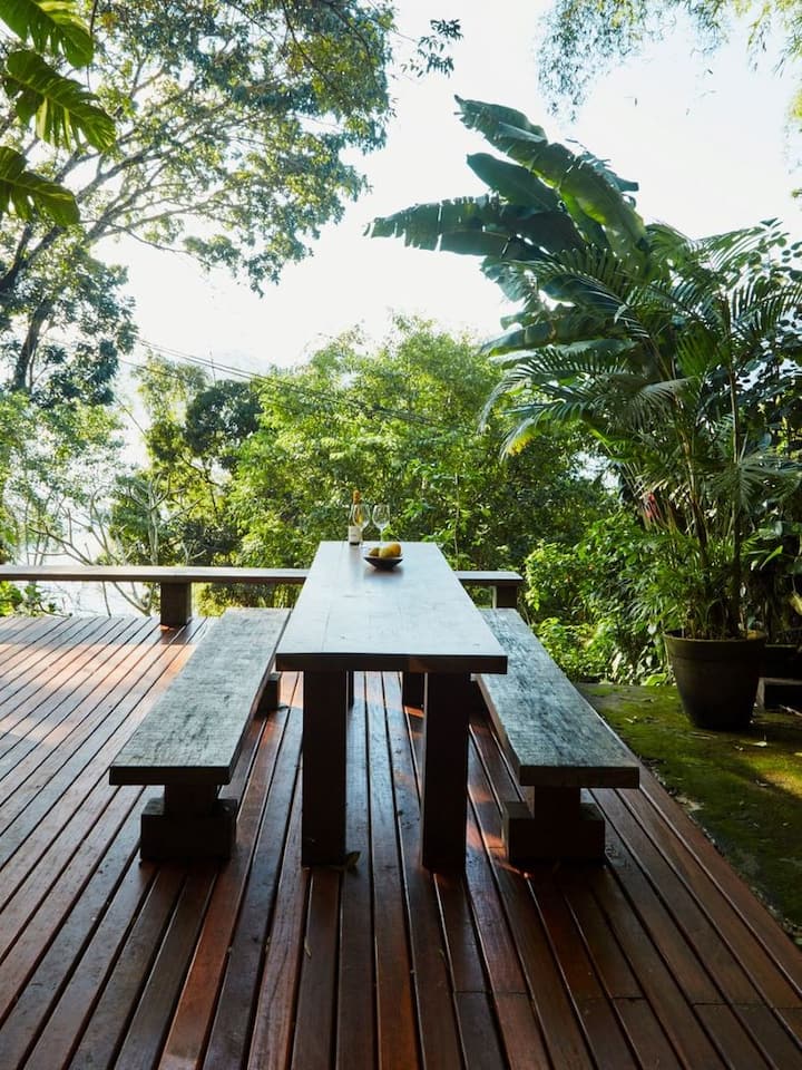 The house is decorated with Brazilian design and premium art pieces, and offers a charming living room, a small kitchen with access to indoor and outdoor dining areas, two beautiful dining tables (outdoor and indoor) and a large terrace with a dining area. outdoor, wooden table and hammock.