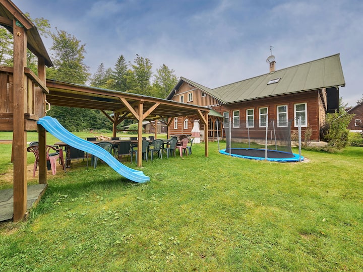 คอทเทจ "Švýcarský dvůr Lodge" สะดวกสบาย 2 ชั้น แยกตัวจากศตวรรษที่ 19 ในรีสอร์ทห่างจากใจกลางยานสเกอ ลาซเน 800 ม. ในทำเลที่เงียบสงบ ห่างจากพื้นที่เล่นสกี 200 ม. ส่วนตัว: สวนขนาดใหญ่ 3,000 ตร.ม. พร้อมสนามหญ้า ลานเฉลียง เฟอร์นิเจอร์สวน บาร์บีคิว สนามเด็กเล่น (สไลเดอร์ ชิงช้า) ในคอมเพล็กซ์: แทรมโพลีนระบบทำความร้อนส่วนกลาง ที่จอดรถที่บ้าน ร้านขายของชำ 1.2 กม. ซูเปอร์มาร์เก็ต 2 กม. ร้านอาหาร 1 กม. คาเฟ่ 1 กม. ป้ายรถเมล์ "Janské Lázně, Lesní dům" 700 ม. สถานีรถไฟ "Svoboda nad Úpou" 2.8 กม. สระว่ายน้ำกลางแจ้ง 1 กม. สระว่ายน้ำในร่ม 1 กม. ห้องอาบน้ำร้อน "Janské Lázně" 1 กม. สนามกอล์ฟ (18 หลุม) 8 กม., เทนนิส 800 ม., มินิกอล์ฟ 2.5 กม., สนามขี่ม้า 2 กม., เส้นทางเดินจากบ้าน 20 ม., เลนปั่นจักรยาน 700 ม., ลิฟต์สกี 900 ม., กระเช้ากอนโดลา 1.7 กม., ทางลาด 200 ม., สกีให้เช่า 600 ม., ป้ายรถเมล์สกี 50 ม., โรงเรียนสอนสกี, เลื่อนวิ่ง 800 ม., สนามสกีครอสคันทรี 2.5 กม., สนามเด็กเล่น 200 ม. สถานที่ท่องเที่ยวใกล้เคียง: Aquacentrum, Janské Lázně Spa 1 km, Stezka korunami stromů Janské Lázně 3 km, RelaxPark Pec, lanovka Sněžka 15 km, zámek Vrchlabí, Aquacentrum Vrchlabí 18 km, Špindlerův Mlýn, Zoo Safari Dvůr Králové 33 km, Adršpašské skály 42 km. สามารถเดินทางไปยังพื้นที่เล่นสกีที่มีชื่อเสียงได้อย่างง่ายดาย: ยันสเกอลาซเน่ - คอสตัลกา 1.5 กม. เซอร์นาโฮรา - เพค 1900 ม. มลาเดบูกี 7 กม. ฮอร์นีมาลาอูปา 20 กม. สปินเดลรูฟมลิน 34 กม. สามารถเดินทางไปยังทะเลสาบที่มีชื่อเสียงได้อย่างง่ายดาย: ดอลเช่ทรูตนอฟ 18 กม. เส้นทางเดินป่า: krkonošské naučné stezky.