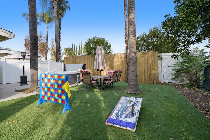 สวนหลังบ้านที่มีอ่างน้ำร้อนและเกมกลางแจ้งมีคอร์นโฮลและเชื่อมต่อ 4 เข้าถึงส่วนที่เหลือของบ้านได้เช่นกัน
