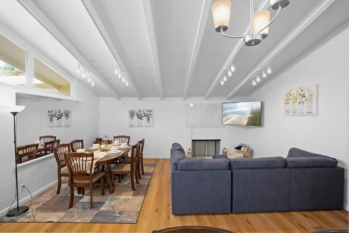 หัวใจของที่พักแห่งนี้คือครัวแบบเปิดโล่งความฝันเกี่ยวกับอาหารที่มีเคาน์เตอร์ควอตซ์เกาะที่มีเก้าอี้บาร์สำหรับมื้ออาหารแบบสบายๆและเครื่องใช้สแตนเลสที่ทันสมัยรวมถึงเครื่องปิ้งขนมปังที่สะดวกสบายและ Keurig ห้องนั่งเล่นที่อยู่ติดกันน่าอยู่มีเพดานโค้งเตาผิงตกแต่งและสมาร์ททีวีเหมาะสำหรับความบันเทิงหรือช่วงเย็นที่เงียบสงบ พื้นที่รับประทานอาหารพร้อมโต๊ะ 6 ตัวและกระจกบานใหญ่เน้นความรู้สึกกว้างขวางของที่พัก