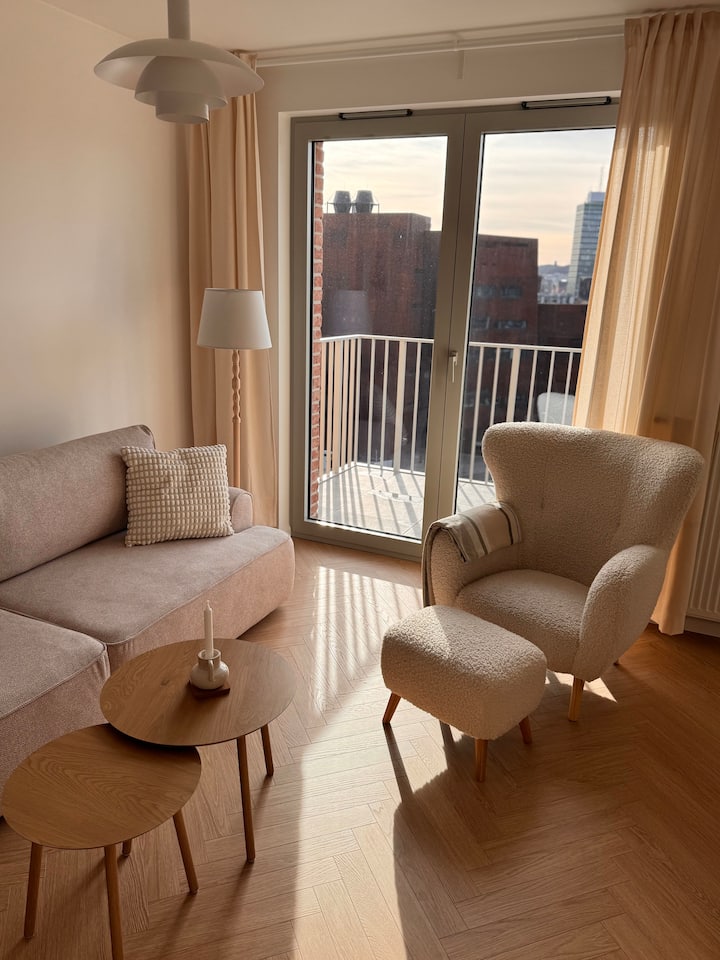อพาร์ทเมนท์มีระเบียงสองแห่งที่มองเห็นพื้นที่อู่ต่อเรือและเส้นขอบฟ้าของเมือง