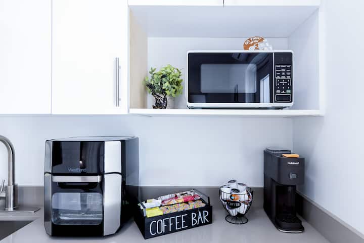☕ สิ่งอำนวยความสะดวกเพิ่มเติม: กาแฟน้ำตาลเกลือพริกไทยและน้ำมันเพื่อให้คุณรู้สึกเหมือนอยู่บ้าน