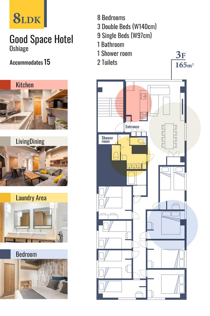 ที่พัก 8LDK รองรับผู้เข้าพักได้สูงสุด 15 คนเหมาะสำหรับครอบครัวและกลุ่ม ห้องนอนแต่ละห้องมีเครื่องปรับอากาศโต๊ะทำงานและที่เก็บของ ห้องนั่งเล่นมีทีวีขนาด 65 นิ้วพร้อมเน็ตฟลิกซ์