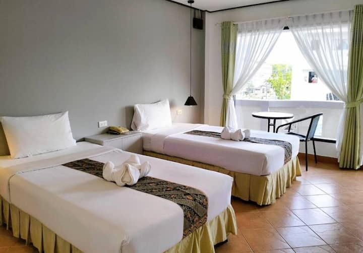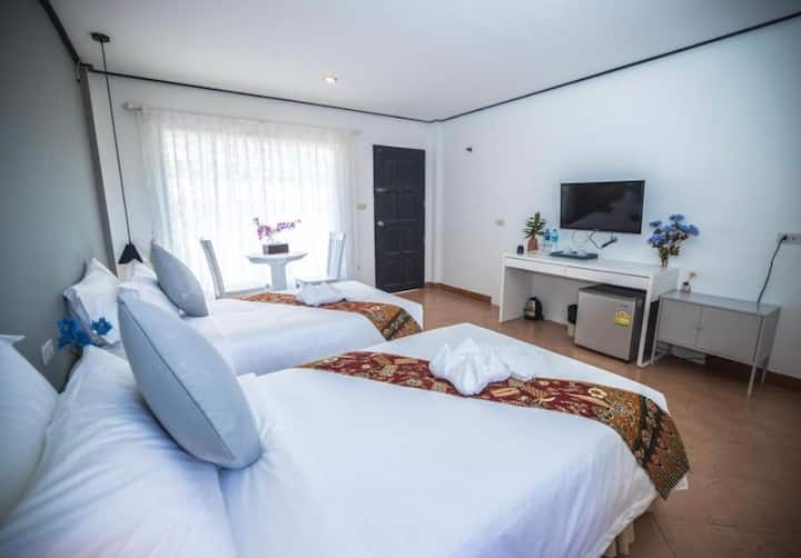ห้องสบายๆ เตียงคู่สีฟ้าใกล้ศูนย์ช้อปปิ้ง