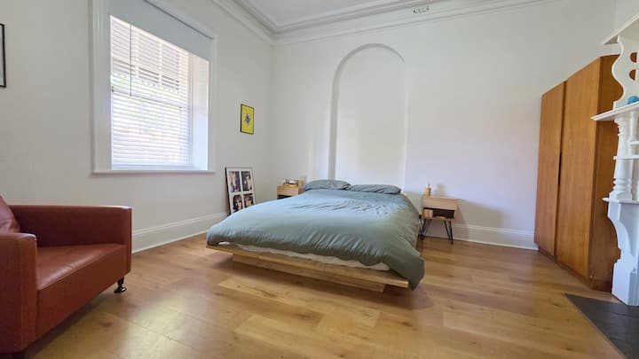 ห้องนอนขนาดใหญ่ที่เต็มไปด้วยแสงแดดพร้อมเตียงควีนไซส์
