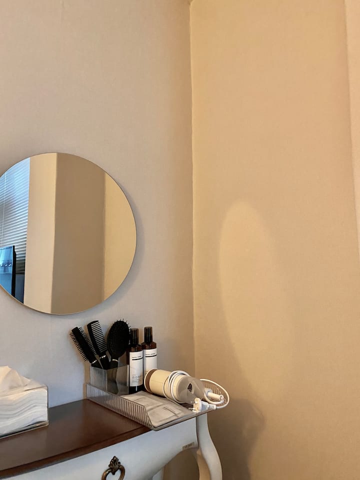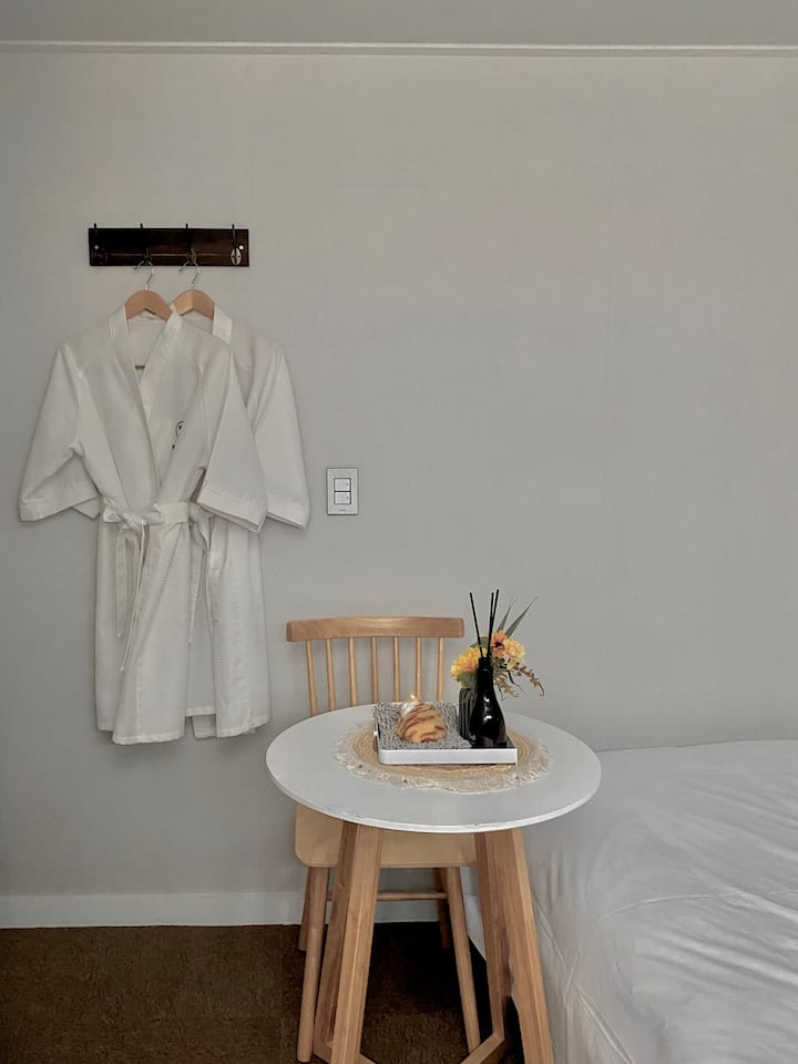 อุปกรณ์พื้นฐาน: น้ำ 2 💧ขวด แชมพู ทรีทเมนท์ ครีม🧴อาบน้ำ แปรงสีฟันแบบใช้แล้วทิ้ง ยาสีฟัน🪥มีดโกน โฟมทำความสะอาด🧼สบู่ แผ่นสำลี ไม้สำลี ผ้าเช็ดตัว 4 ผืน ไดร์เป่าผม🛏️💨เสื้อคลุม 🧥