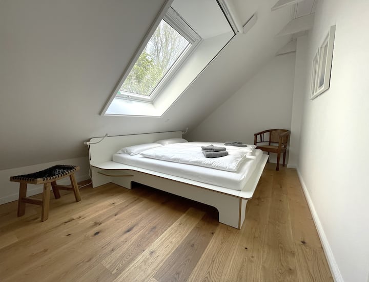 ชั้นบนมีห้องนอนที่ตกแต่งอย่างมีรสนิยม 2 ห้อง 1x พร้อมเตียงคู่ (200x180 ซม.) 1x พร้อมเตียงเดี่ยว (200x80 ซม.) หรือเตียงคู่ (200x160 ซม.) ห้องนอนที่หันหน้าไปทางทิศตะวันออกยังมีโต๊ะทำงานแยกเป็นพื้นที่ทำงาน วิวที่มีอยู่ที่นี่จากหน้าต่างกลมประวัติศาสตร์เหนือทางเข้าโรงนาเก่ายังทำให้อพาร์ทเมนท์มีความพิเศษและเป็นรายบุคคล นอกจากนี้ชั้นบนยังมีห้องน้ำที่ทันสมัยและกว้างขวางอีกห้องหนึ่งมีฝักบัวอาบน้ำแบบสายฝนจากพื้นจรดเพดานเครื่องทำความร้อนโถสุขภัณฑ์และผ้าขนหนู