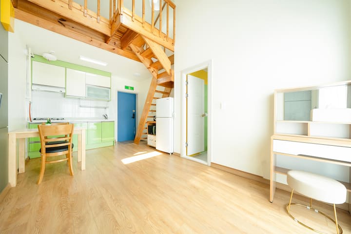 ดูเพล็กซ์: ห้องนั่งเล่น + ห้องครัว + ห้องนอน A (เตียงคู่ 1 หลัง) + ห้องน้ำ 1 ห้อง