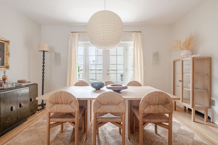 พื้นที่รับประทานอาหารมองออกไปที่ระเบียงอาบน้ำในเวลากลางวันและทอดสมอโดยโต๊ะไม้โอ๊คสไตล์มินิมอลของ Danielle Siggerud ซึ่งเป็นฐานโค้งสะท้อนจังหวะออร์แกนิกของที่พัก ล้อมรอบเก้าอี้เร่งด่วนสไตล์วินเทจพร้อมฉากหลังโค้งของ Charlotte Perriand-invite ช้าๆและบทสนทนาที่ยาวนาน ด้านบนเป็นโคมไฟกระดาษข้าวขนาดใหญ่ลอยเหมือนดวงจันทร์กระดาษในขณะที่โคมไฟ Murano สไตล์วินเทจช่วยเพิ่มความเย้ายวนใจในโลกเก่า ริมกำแพงด้านหนึ่งมีคอนโซลวูดที่เปื้อนมะกอกวางอยู่ใต้ภาพวินเทจของความงามของสังคมในขณะที่ตู้คิวริโอที่มีกระจกรีดระยิบระยับอย่างนุ่มนวลซึ่งเป็นการศึกษาที่เงียบสงบในพื้นผิวความทรงจำและความยับยั้งชั่งใจ