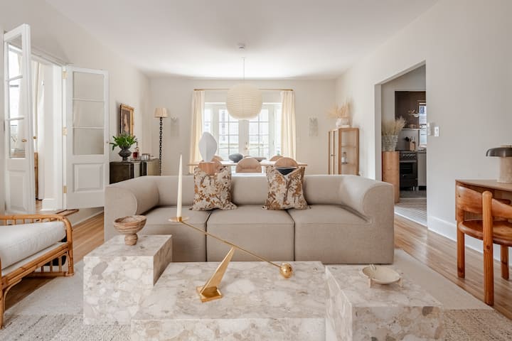 ก้าวเข้าไปในโถงทางเดินที่ยาวเหมือนแกลเลอรี่ซึ่งมีอิฐทรายสีซีดที่ปูด้วยมือเรียงรายอยู่บนพื้นและประตูไร้กรอบจะหายไปในผนัง กระจกหมุนและไฟเพดานทองเหลืองเป็นเงาปริซึมนำทางคุณผ่านกระจกทางทะเลโดย Krøyer Lassen ที่วางเท้ากำมะหยี่มะกอกที่ตัดขอบด้วยขอบและชั้นวางของหินอ่อนที่ประดับด้วยของที่สะสมไว้ ระหว่างทางคุณจะพบกับตู้เสื้อผ้าแบบวอล์คอินขนาดใหญ่และห้องแป้งกล่องอัญมณีหุ้มด้วยหินอ่อนแบบตาหมากรุกและ Calacatta Viola โถงทางเดินเปิดไปยังห้องโถงเล็กๆที่ล้อมรอบด้วยจี้สติลโนโวสไตล์วินเทจเก้าอี้บูเคิลและแท่นบูร์ลวูดที่หุ้มด้วยแจกันบาโรเวียร์มูราโนที่เต็มไปด้วยพืชพรรณแห้ง ยิ่งไปกว่านั้นห้องครัวยังรออยู่ด้านข้างอย่างระมัดระวัง