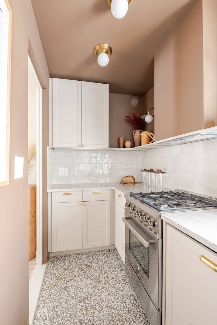 ห้องครัวที่ซ่อนตัวอยู่ไม่ไกลจากห้องโถงปกคลุมไปด้วยช็อกโกแลตสีน้ำตาลเข้มซึ่งเป็นจุดที่เต็มไปด้วยอารมณ์แปรปรวนและเป็นกันเองกับจานสีที่ถูกล้างด้วยแสงแดดของอพาร์ทเมนท์ ตู้เชคเกอร์สมัยใหม่ที่เป็นเอกลักษณ์ของเราตกแต่งด้วยอุปกรณ์ทองเหลืองเรียวเล็กสร้างฉากหลังที่มีเสน่ห์อย่างเงียบๆสำหรับพิธีกรรมในชีวิตประจำวัน ไฟทองเหลืองเล็กๆโดย Michelle Aero จุดบนเพดานเหมือนเครื่องประดับทำให้ที่พักมีกระเป๋า Gucci เรืองแสงมากกว่าแกลลีย์ แม้จะมีขนาดกะทัดรัดแต่ห้องครัวได้รับการตกแต่งอย่างสวยงาม ตู้ซักรีดเฉพาะในห้องโถงมีเครื่องซักผ้าและเครื่องอบผ้า Miele แบบวางซ้อนกันได้เต็มรูปแบบซ่อนอยู่และใช้งานได้อย่างง่ายดาย