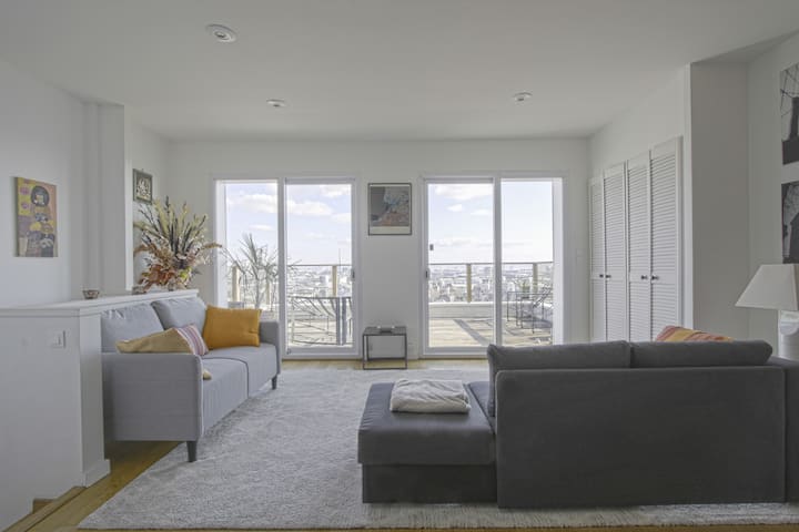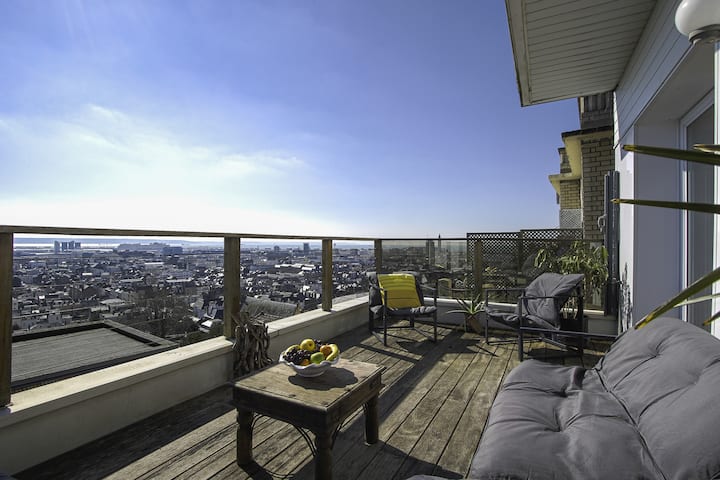 บ้านพร้อมระเบียงที่มองเห็นทิวทัศน์ของเมืองและทะเล