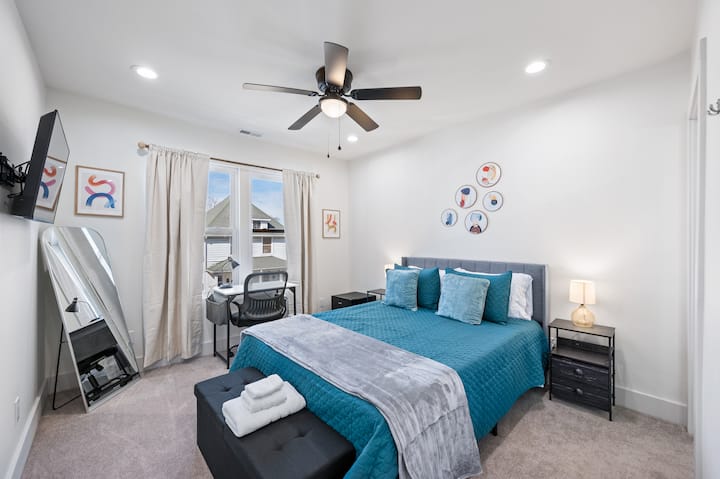 ห้องพักพร้อมห้องน้ำส่วนตัว อู่รถ + ตู้เย็น ทีวี โต๊ะทำงาน