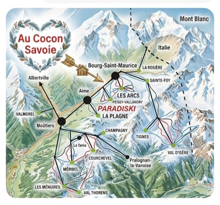 ตั้งอยู่บนเส้นทางหลักอย่างเหมาะสม ใช้เวลาขับรถ 5 นาทีจากบูร์ก-แซ็ง-มอรีส-เล-ซาร์ก🤗 รีสอร์ทแห่งเดียวในฝรั่งเศสที่เชื่อมต่อโดยตรงกับพื้นที่สกีด้วยรถกระเช้า (ทุก 20 นาทีตั้งแต่เวลา 7.00 น. ถึง 21.00 น. และแม้แต่เวลา 23.00 น. ในคืนวันศุกร์และวันเสาร์ในช่วงฤดูหนาว)
