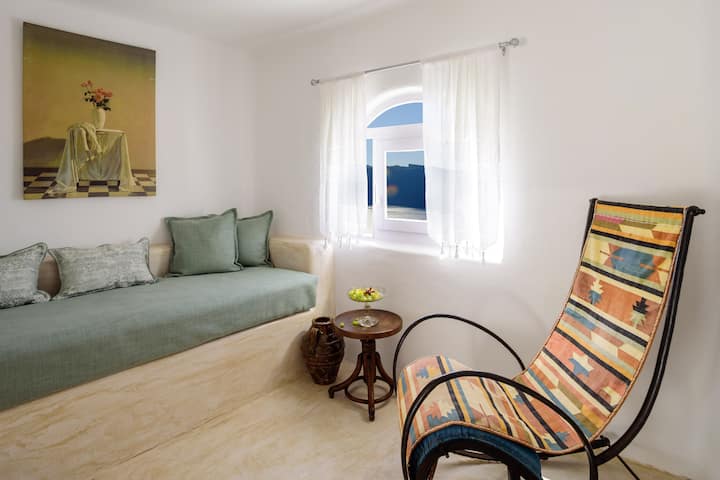 It is located on the lowest level of the Caldera and offers the possibility of walking down to “Ammoudi 's" picturesque Port via a trail with numerous steps.