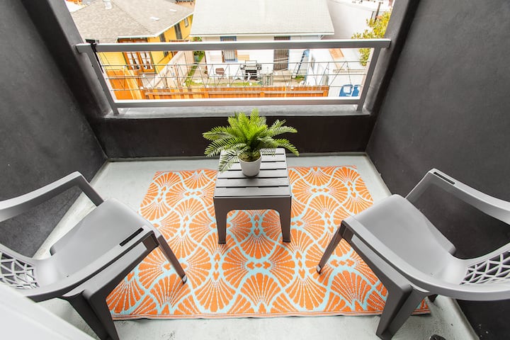 เตียงคิงไซส์ทันสมัยพร้อมระเบียงจากคาเฟ่และยูนิไฮท์ส