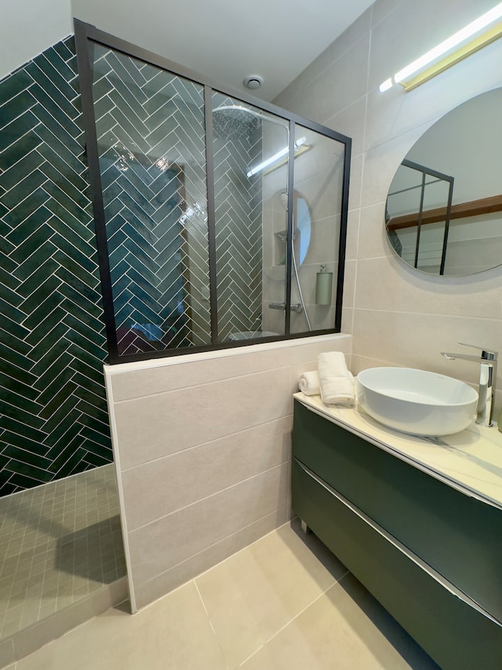 - ห้องน้ำที่สะดวกสบายพร้อมฝักบัวและอ่างล้างหน้า