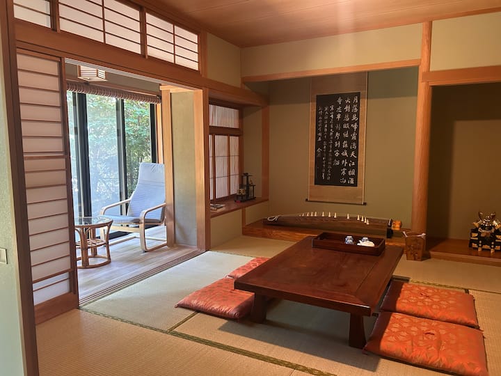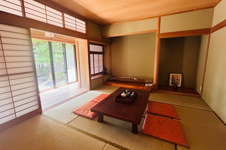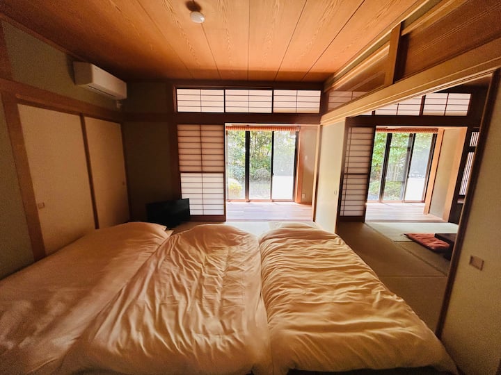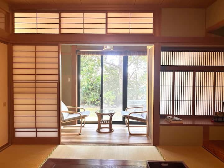 ในห้องพักสไตล์ญี่ปุ่น 2 ห้อง (เสื่อทาทามิ 8 อัน + เสื่อทาทามิ 8 อัน) ที่มีบรรยากาศเหมือนโรงเตี๊ยม คุณสามารถผ่อนคลายในเฉลียงและออกไปที่สวน และเพลิดเพลินกับช่วงเวลาอันเงียบสงบ