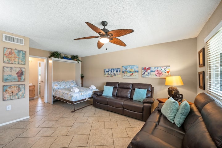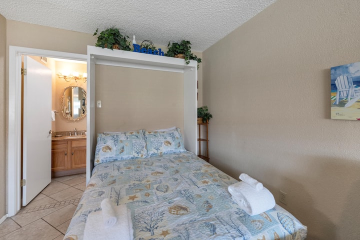 ห้องนอนกว้างขวาง 1 ห้อง ห่างจากชายหาดเพียงช่วงตึก สระว่ายน้ำขนาดใหญ่พร้อมอุปกรณ์อำนวยความสะดวก