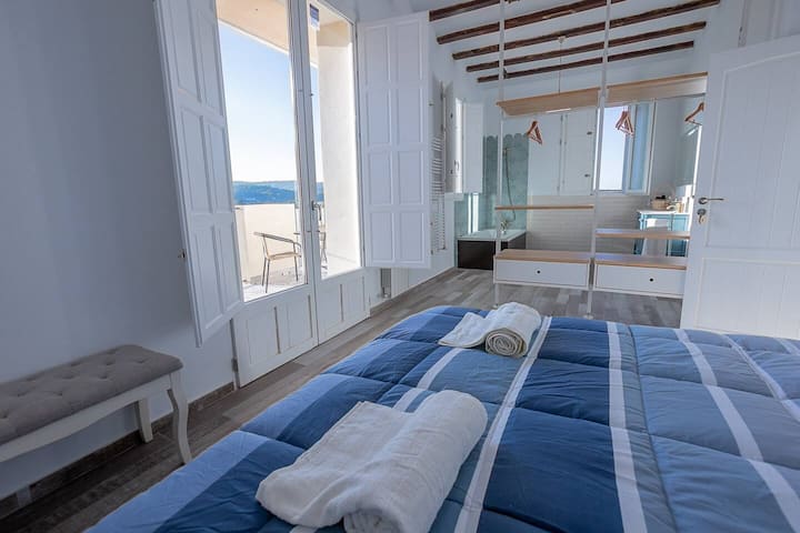 ห้อง 4: ห้องสวีทซาโลก (SE) ห้องพักขนาด 35 ตร.ม. และระเบียงกลางแจ้งขนาด 15 ตร.ม. ที่มุ่งเน้นไปทางทิศตะวันออก ประเภทห้องอาบแดด พร้อมเตียงคู่ขนาด 1.60x2.00 ม. และตู้เสื้อผ้าและโต๊ะคู่ มีห้องน้ำในตัวพร้อมโถสุขภัณฑ์ อ่างล้างหน้า และอ่างน้ำวน ราคา: €120