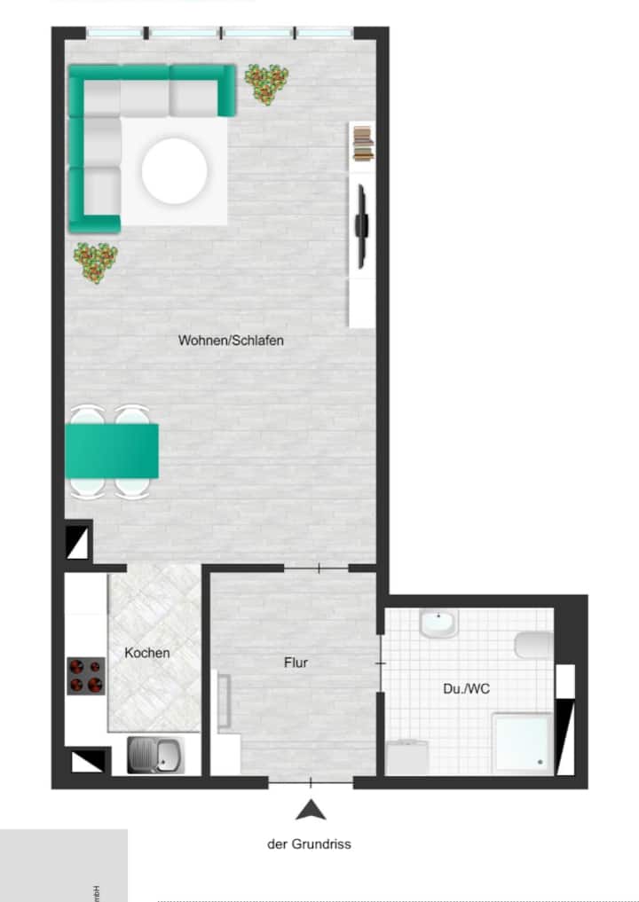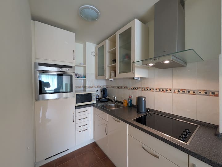อพาร์ทเมนท์สว่างและมีอุปกรณ์ครบครันบนชั้น 2 มองเห็นสนามหญ้าสีเขียว ห้องครัวแบบเปิดโล่ง (เนฟฟ์/ซีเมนส์) ห้องน้ำทันสมัยพร้อมฝักบัวอาบน้ำและเครื่องอบผ้า ตู้เสื้อผ้าแบบติดตั้ง และพื้นที่นั่งเล่น/นอนพร้อมเตียง (140 × 200) โต๊ะรับประทานอาหารและโต๊ะทำงาน เครื่องซักผ้าในห้องซักรีดส่วนกลาง (มีค่าบริการ) ในบ้าน