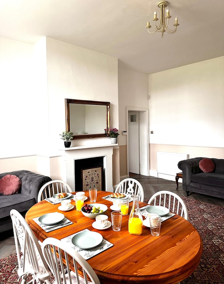 เมื่อเข้ามาในที่พัก คุณจะพบกับห้องรับประทานอาหาร/ห้องนั่งเล่นขนาดใหญ่ โต๊ะรับประทานอาหารและที่นั่งสำหรับ 7 ท่าน ทำให้ผู้เข้าพักสามารถรวมตัวกันและเพลิดเพลินกับอาหาร เล่นเกม หรือเรียนได้ นอกจากนี้ยังมีที่นั่งเพิ่มเติมเพื่อชมวิวทางเข้าที่กว้างขวางและพื้นที่ป่าที่อยู่เบื้องหลัง