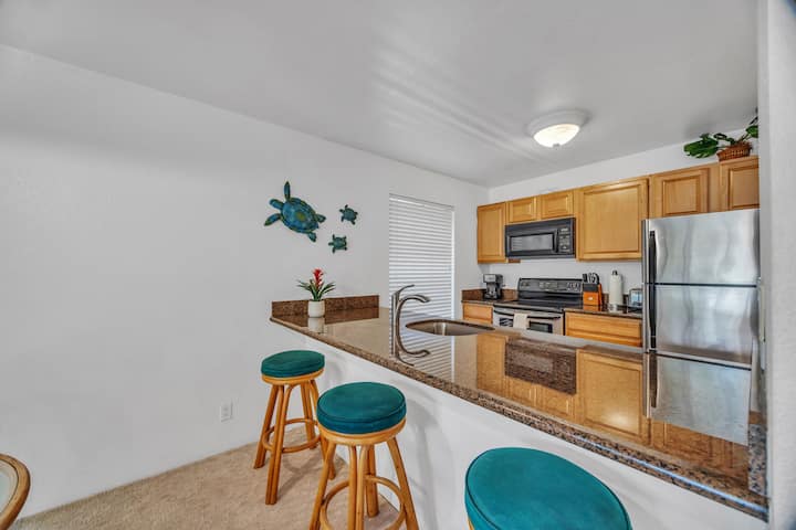 ค้นพบแก่นแท้ของสวรรค์ฮาวายที่ Maui Kamaole C-106 ที่พักผ่อนที่เงียบสงบและมีสไตล์ซึ่งตั้งอยู่ในรีสอร์ท Maui Kamaole ที่เป็นที่ต้องการอย่างมากในเซาท์เมาวี คอนโดชั้นล่างที่ได้รับการดูแลอย่างพิถีพิถันนี้ต้อนรับคุณด้วยแสงธรรมชาติที่อุดมสมบูรณ์ สร้างบรรยากาศที่สว่างและโปร่งสบายที่ชวนให้ผ่อนคลายได้ทันที ก้าวออกไปข้างนอกและผ่อนคลายบนระเบียงสวนสองแห่งที่เขียวชอุ่ม หนึ่งในนั้นมีความเป็นส่วนตัวทั้งหมด เหมาะสำหรับการพักผ่อนในตอนเช้าที่เงียบสงบหรือตอนค่ำที่เป็นกันเอง ภายในคอนโดมีการตกแต่งภายในที่ได้รับการปรับปรุงอย่างมีรสนิยมและตกแต่งด้วยสไตล์ฮาวายที่หรูหรา ซึ่งผสมผสานเสน่ห์ของเกาะและความสะดวกสบายทันสมัยได้อย่างลงตัว ระบายความร้อนด้วยเครื่องปรับอากาศแบบแยกส่วนใหม่ สัมผัสความเร็วของ Wi-Fi และนั่งดูหนังยามค่ำคืนบนทีวีจอใหญ่ในห้องนั่งเล่นที่มีช่องเคเบิลระดับพรีเมียม ที่จอดรถเฉพาะอยู่ห่างจากที่พักเพียงไม่กี่ก้าว ทำให้การเดินทางมาถึงและออกเดินทางเป็นไปอย่างราบรื่น สำหรับผู้ที่ชอบทำอาหาร ห้องครัวที่มีอุปกรณ์ครบครันมีเครื่องใช้ไฟฟ้าที่ทันสมัยและเครื่องครัวทั้งหมดที่คุณต้องใช้ในการเตรียมอาหารเขตร้อนที่คุณชื่นชอบ หลังจากผจญภัยบนเกาะมาทั้งวัน ก็ได้พักผ่อนบนเตียงคิงไซส์สุดหรูพร้อมเครื่องนอนระดับพรีเมียมหรือพักผ่อนในห้องน้ำใหญ่ที่ได้รับการปรับปรุงใหม่ทั้งหมด ซึ่งมีฝักบัวอาบน้ำกระเบื้องเรียบง่ายและอ่างแช่น้ำรอช่วยให้คุณผ่อนคลาย ห้องนอนเปิดออกสู่ระเบียงส่วนตัวในสวนส่วนตัว ทำให้คุณได้ดื่มด่ำกับทิวทัศน์ เสียง และกลิ่นของธรรมชาติอันเขียวชอุ่มของเมาวี ไม่มีบันไดให้ขึ้นและไม่มีลิฟต์ให้รอ ห้องพักนี้มอบความสะดวกสบาย ความเป็นส่วนตัว และความสะดวกสบายสูงสุด ให้ Maui Kamaole C-106 เป็นโอเอซิสที่สงบและเป็นที่พักที่สมบูรณ์แบบของคุณในขณะที่คุณโอบกอดจิตวิญญาณอะโลฮ่าและสร้างความทรงจำที่ไม่มีวันลืมในเมาวี