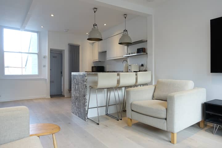 อพาร์ทเมนท์ที่สะดวกสบาย สว่าง และมีเสน่ห์ในอาคารเกรด 2 อายุ 250 ปีที่ตั้งอยู่ใจกลางหมู่บ้านแฮมป์สเต็ดที่มีชีวิตชีวาและพิเศษ