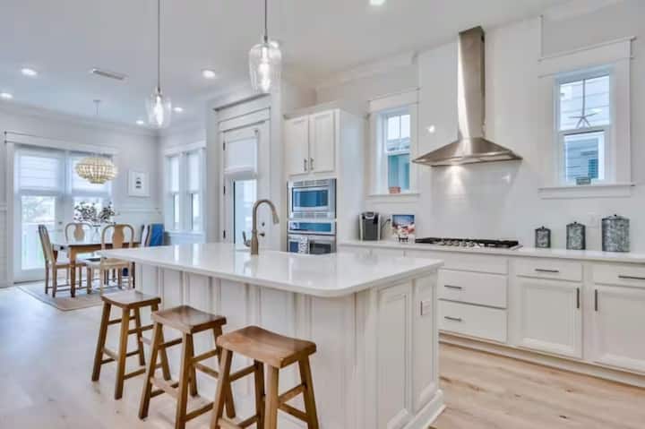 Beach Please เป็นทาวน์โฮม 2 ชั้นที่ได้รับการออกแบบอย่างมีสไตล์เพื่อให้คุณมีความสุขตลอดทั้งวันและการเข้าพักของคุณ ในฐานะที่เป็นคนพื้นเมืองของฟลอริดา พิงกี้ชื่นชอบแสงแดดมาก และรังนกเล็กๆ นี้ไม่ทำให้ผิดหวังเลย หน้าต่างหลายบานทำให้แสงอาทิตย์ของฟลอริด้าสาดส่องเข้ามาและดูเหมือนจะทำให้ห้องเปิดโล่งมีความสุข พิงกี้ยิ้มขณะอาบแสงอาทิตย์ริมชายฝั่ง การตกแต่งแบบคลาสสิก เช่น พื้นไม้ที่มีรอยเสียหาย เฟอร์นิเจอร์สีฟ้าขาวที่มีผ้าคลุม ผนังไม้ที่ประกบกัน ทั้งหมดนี้รวมกันสร้างบรรยากาศที่เย็นสบายและผ่อนคลาย พิงกี้สามารถจินตนาการถึงเพื่อนและครอบครัวที่มารวมตัวกันรอบๆ เกาะครัวขนาดใหญ่ในขณะที่เชฟของกลุ่มทำอาหารมื้อใหญ่ที่น่าจดจำ ห้องครัวที่สะอาดและทันสมัยพร้อมเครื่องใช้ไฟฟ้าเหล็กไร้สนิมจะเป็นฉากหลังที่สมบูรณ์แบบสำหรับโอกาสดังกล่าว จานชาม ช้อนส้อม เครื่องดื่ม หม้อและกระทะทุกอย่างดูเรียบร้อย