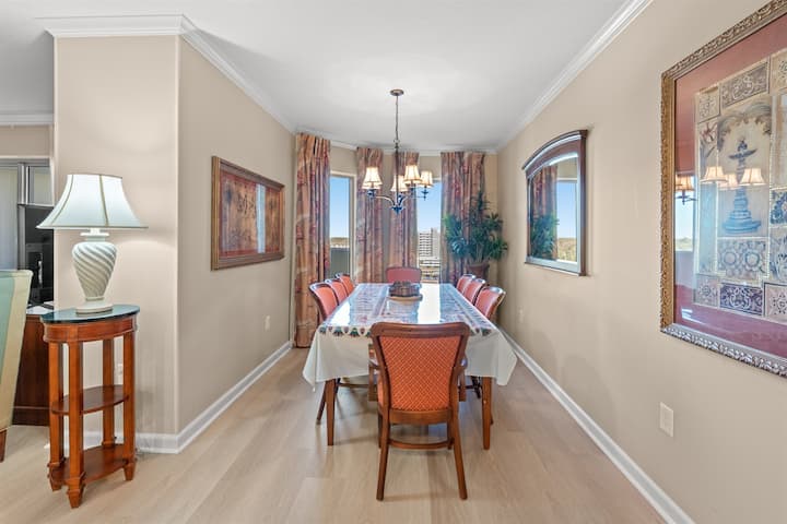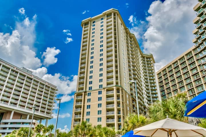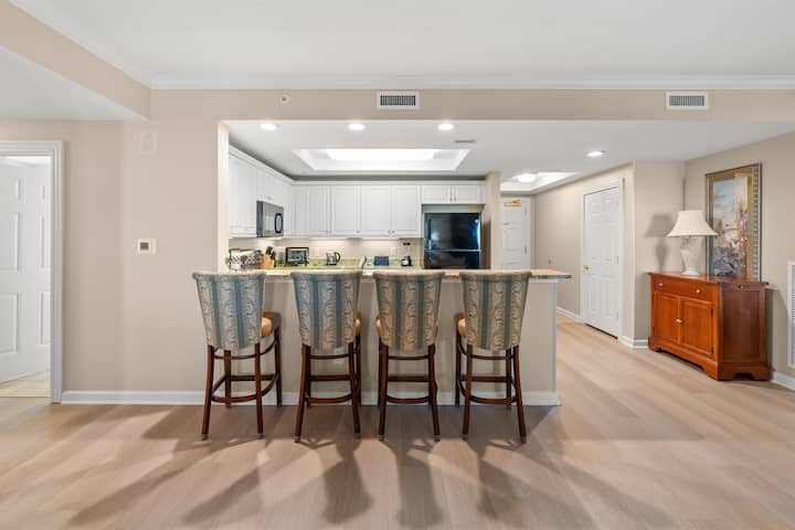 ที่พัก 2 ห้องนอน/2 ห้องน้ำวิวทะเลนี้มีห้องครัวเต็มรูปแบบ ระเบียงขนาดใหญ่เพื่อชมทะเล ทะเลสาบ และสภาพแวดล้อมที่มองเห็นน้ำพุและภูมิทัศน์ที่สวยงาม ห้องนอนใหญ่มีเตียงขนาดคิงไซส์ ตู้ลิ้นชัก ทีวี เก้าอี้เลานจ์ โต๊ะข้างเตียง 2 ตัว และตู้เสื้อผ้าแบบวอล์คอินขนาดใหญ่ที่เข้าถึงระเบียงได้ ห้องน้ำใหญ่มีอ่างล้างหน้าคู่ อ่างจากุซซี่ และฝักบัวอาบน้ำแยกต่างหาก ห้องนอนที่สองมีเตียงควีนไซส์ 2 เตียง ตู้ลิ้นชัก ทีวี และตู้เสื้อผ้าแบบวอล์คอิน ห้องรับประทานอาหารที่สวยงามนั่งได้ 8 ที่นั่งแยกออกจากห้องนั่งเล่นซึ่งมีทางเข้าระเบียงและมีโซฟาหนังเอนกาย โซฟาปิดเก็บเตียงและเก้าอี้ โต๊ะข้างเตียง 2 ตัวและโต๊ะกาแฟและสมาร์ททีวี ครัวขนาดใหญ่พร้อมเคาน์เตอร์หินแกรนิตและบาร์ที่นั่งได้ 4 ที่นั่งมีทุกอย่างที่คุณต้องการสำหรับการทำอาหารและมีเครื่องชงกาแฟ (แบบหยดหลายแก้วและแบบแคปซูลคิวริก) เครื่องปิ้งขนมปังแบบปั่นได้ กาต้มน้ำสำหรับชา ไมโครเวฟ เตาอบและเตาไฟฟ้า ช้อนส้อม จานชาม หม้อและกระทะที่คุณต้องการสำหรับ 12 คน นอกจากนี้ยังมีเครื่องล้างจาน เครื่องทิ้งขยะ เครื่องซักผ้าและเครื่องอบผ้า LG ใหม่ นอกจากนี้ยังมีห้องน้ำขนาดใหญ่ที่ 2 พร้อมอ่างล้างหน้าคู่