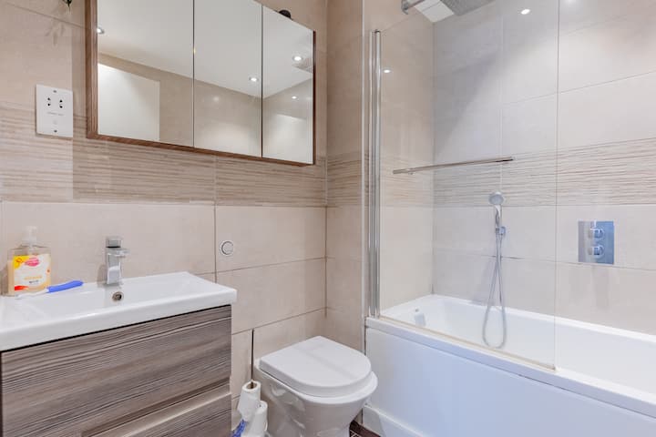 ห้องน้ำได้รับการออกแบบอย่างพิถีพิถันด้วยอุปกรณ์ร่วมสมัยเพื่อให้ทั้งสไตล์และการใช้งาน มีอ่างอาบน้ำที่ผ่อนคลายพร้อมที่อาบน้ำแบบฝักบัว เลือกได้ว่าจะล้างตัวแบบเร็วๆ หรือแช่ตัวแบบสบายๆ ตู้กระจกมีพื้นที่เก็บของที่มีประโยชน์และทำให้การเตรียมตัวเป็นเรื่องง่าย ในขณะที่ราวแขวนผ้าขนหนูอุ่นเพิ่มความหรูหราโดยทำให้ผ้าขนหนูของคุณอบอุ่นและนุ่มหลังจากการใช้งานทุกครั้ง