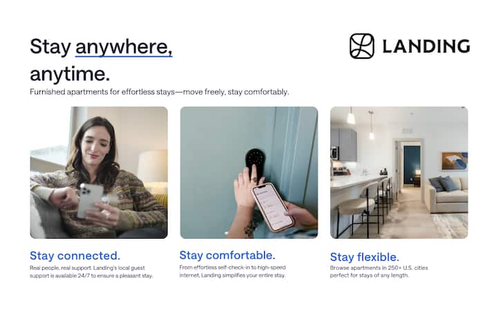 Landing เป็นคอลเล็คชั่นอพาร์ทเมนท์ตกแต่งครบครันทั่วประเทศซึ่งทุกการเข้าพักให้ความรู้สึกเหมือนอยู่บ้าน แลนดิ้งแต่ละแห่งมีเฟอร์นิเจอร์มีสไตล์ห้องครัวที่มีอุปกรณ์ครบครันบริการซักรีดในห้องพื้นที่ทำงาน Wi-Fi ที่รวดเร็วและสิ่งอำนวยความสะดวกระดับพรีเมี่ยม เหมาะสำหรับการเข้าพักทุกระยะเวลาพร้อมฝ่ายสนับสนุนลูกค้าตลอด 24 ชั่วโมงทุกวัน