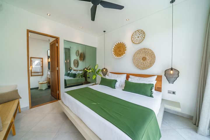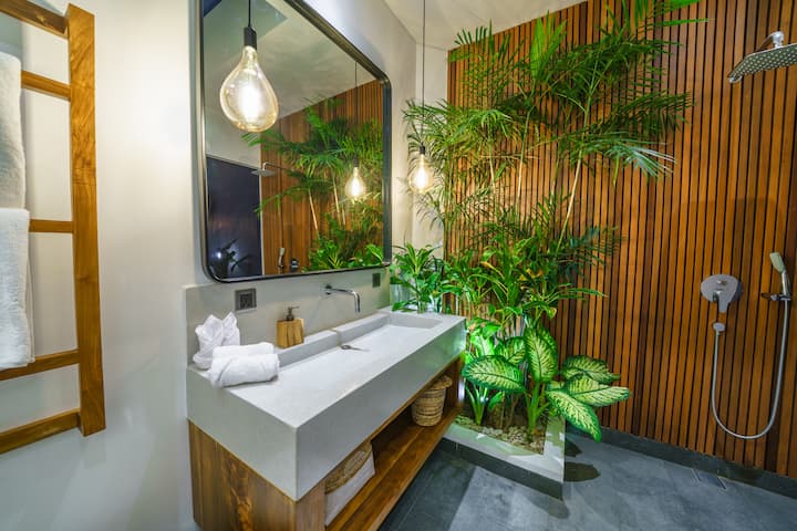 ห้องนอนทั้ง 2 ห้องมีพื้นที่กว้างขวาง มีเครื่องปรับอากาศและเตียงขนาดคิงไซส์ ตกแต่งอย่างมีรสนิยม และมีห้องน้ำในตัว หนึ่งในห้องน้ำมีฝักบัวและจุดเด่นที่ไม่เหมือนใคร อ่างอาบน้ำที่ตั้งอยู่ในสวนเขตร้อนส่วนตัวให้ประสบการณ์การแช่ตัวที่เงียบสงบและเปิดโล่ง ห้องน้ำที่ 2 มีห้องอาบน้ำฝักบัวแบบวอล์คอินพร้อมการตกแต่งที่ทันสมัย