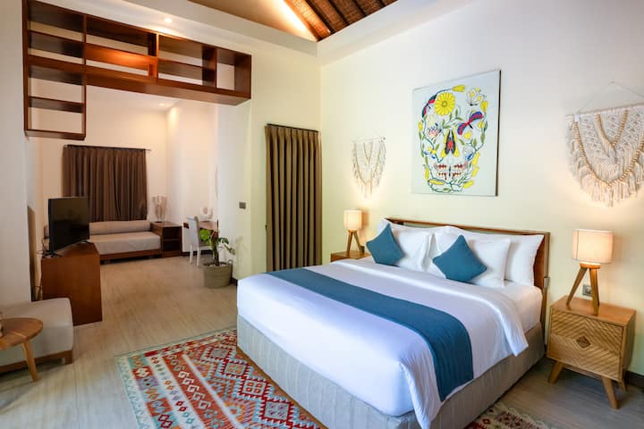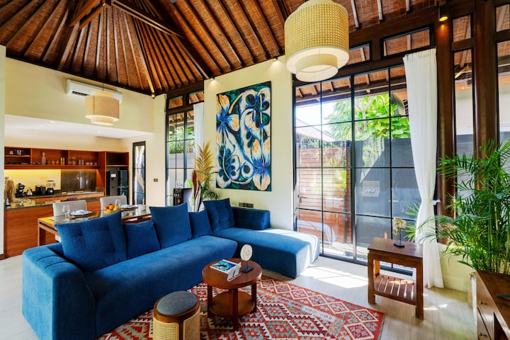 วิลล่าส่วนตัว 1 ห้องนอนในคอมเพล็กซ์โบโฮลูมาที่มีเอกลักษณ์มีสระว่ายน้ำส่วนตัว สวนเขียวชอุ่ม และเก้าอี้อาบแดด เพลิดเพลินกับพื้นที่นั่งเล่นแบบเปิดโล่งพร้อมสมาร์ททีวี โต๊ะรับประทานอาหาร และห้องครัวเต็มรูปแบบ ห้องนอนมีเตียงควีนไซส์ สมาร์ททีวี โซฟา พื้นที่ทำงาน และห้องน้ำในตัวพร้อมอ่างอาบน้ำและที่อาบน้ำ ที่พักผ่อนสุดสงบในบาหลี มีตัวเลือกวิลล่า 2 ห้องนอนสำหรับกลุ่มใหญ่