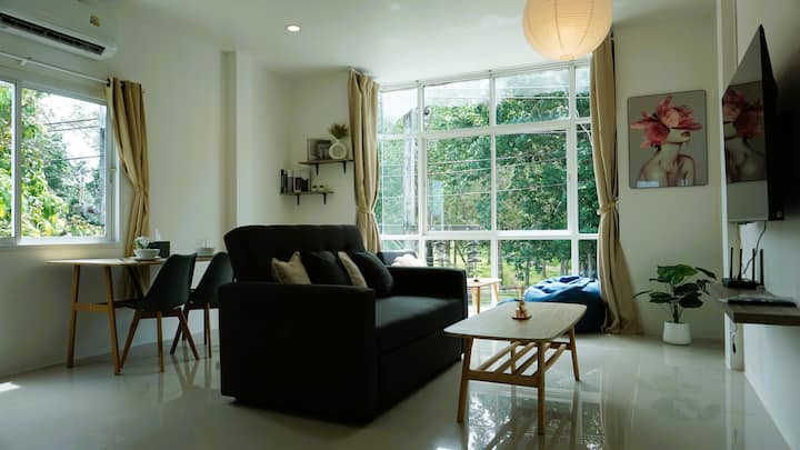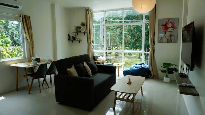 ที่พักสไตล์ราไวย์ที่สว่างไสวพร้อมระเบียงและวิวที่เขียวชอุ่ม