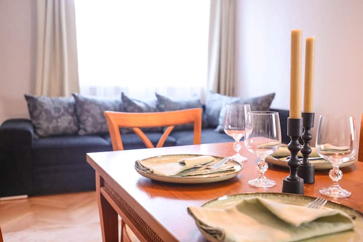ที่พักที่สว่างและน่าอยู่ พร้อมสมาร์ททีวีขนาดใหญ่และ Wi-Fi ความเร็วสูง โซฟาที่นั่งสบายปรับเป็นเตียงได้อย่างง่ายดาย ทำให้อพาร์ตเมนต์แห่งนี้เหมาะสำหรับครอบครัวหรือกลุ่มเพื่อนไม่เกิน 4 คน